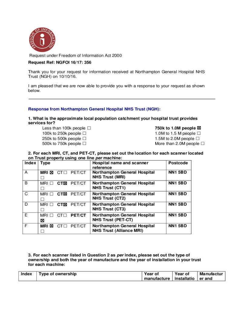 Request under Freedom of Information Act 2000 Request Ref: NGFOI 16/17: 356 Thank you for your request for information received at Northampton General Hospital NHS Trust (NGH) on 10/10/16. I am pleased
