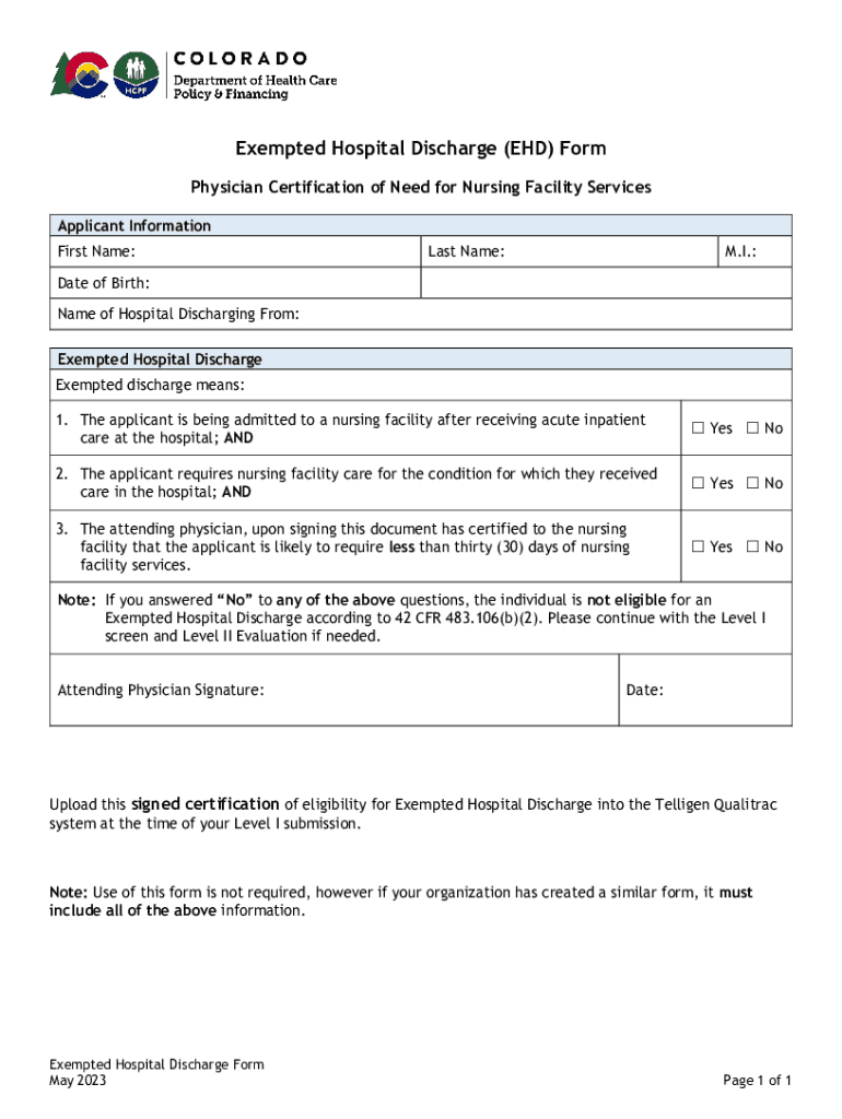 Exempted Hospital Discharge (EHD) Form Physician Certification of Need for Nursing Facility Services Applicant Information First Name:Last Name:M.I.:Date of Birth: Name of Hospital Discharging From: