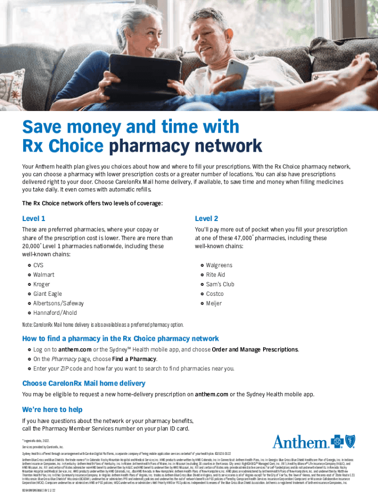 Save money and time with Rx Choice pharmacy network Your Anthem health plan gives you choices about how and where to fill your prescriptions. With the Rx Choice pharmacy network, you can choose a