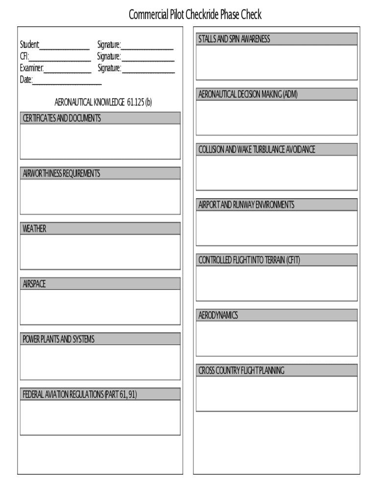 Commercial Pilot Checkride Phase Check Student:___ Signature:___ CFI:___ Signature: ___ Examiner:___ Signature: ___ Date:___ AERONAUTICAL KNOWLEDGE 61.125 (b)STALLS AND SPIN AWARENESSAERONAUTICAL