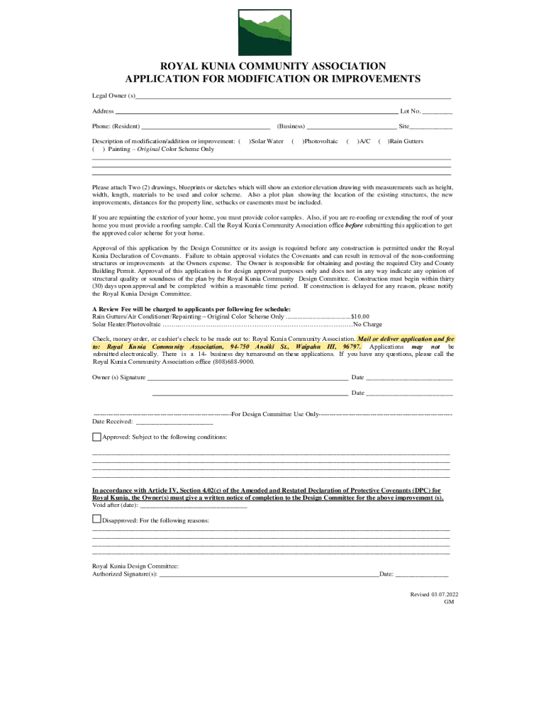 ROYAL KUNIA COMMUNITY ASSOCIATION APPLICATION FOR MODIFICATION OR IMPROVEMENTS Legal Owner (s) Address Phone: (Resident) Description of modification/addition or improvement: ( ( ) Painting Original
