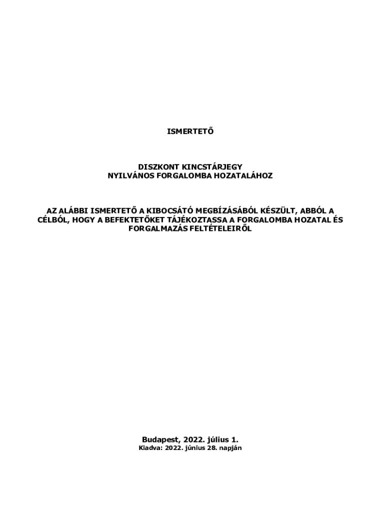 ISMERTETDISZKONT KINCSTRJEGY NYILVNOS FORGALOMBA HOZATALHOZAZ ALBBI ISMERTET A KIBOCST MEGBZSBL KSZLT, ABBL A CLBL, HOGY A BEFEKTETKET TJKOZTASSA A FORGALOMBA HOZATAL S FORGALMAZS FELTTELEIRLBudapest,