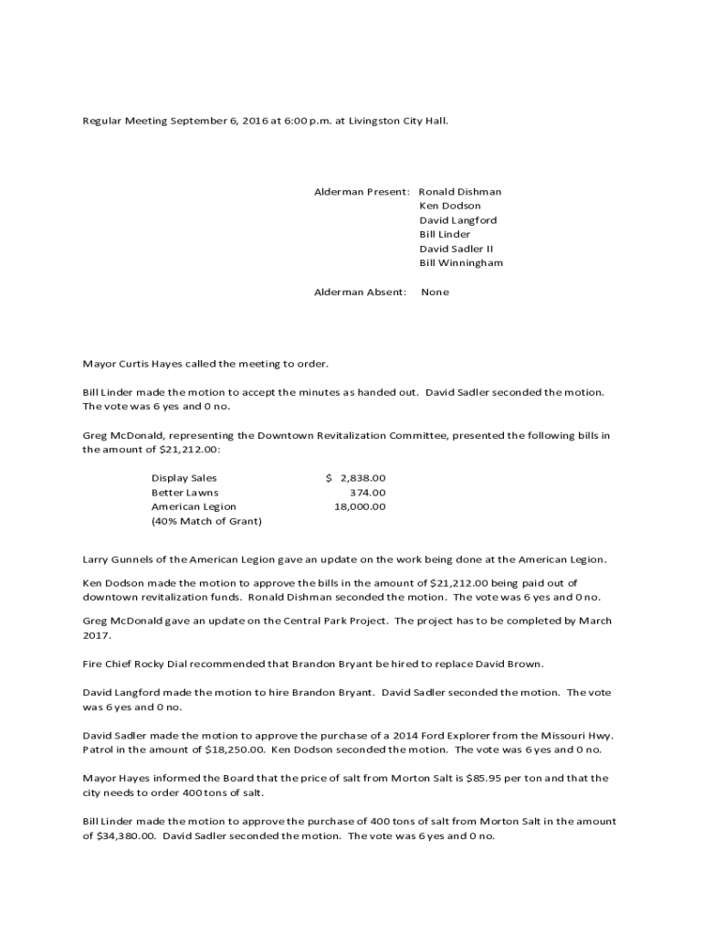 RegularMeetingSeptember6,2016at6:00p.m.atLivingstonCityHall.