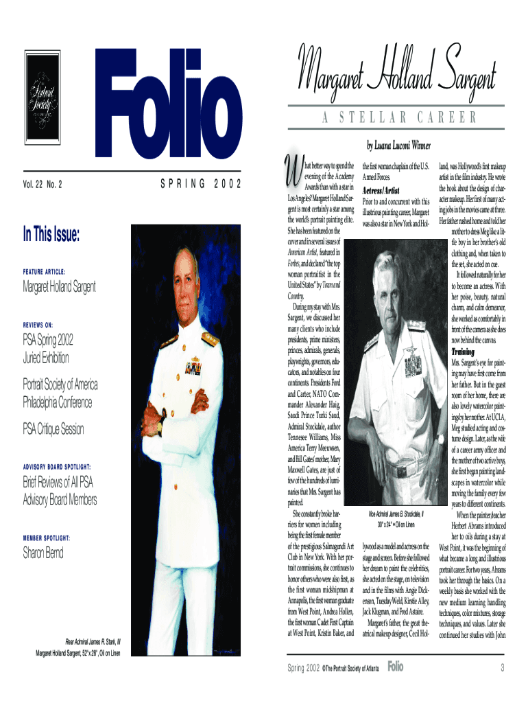 Vo l . 2 2 N o . 2FolioIn This Issue: F E AT U R E A R T I C L E :Margaret Holland Sargent REVIEWS ON:PSA Spring 2002 Juried Exhibition Portrait Society of America Philadelphia Conference PSA Critique