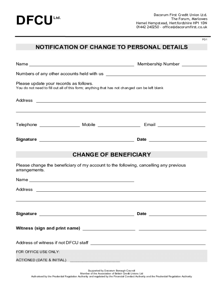 DFCUDacorum First Credit Union Ltd. The Forum, Marlowes Hemel Hempstead, Hertfordshire HP1 1DN 01442 240250 office@dacorumfirst.co.ukLtd.PD1NOTIFICATION OF CHANGE TO PERSONAL DETAILS Name ___ Membership