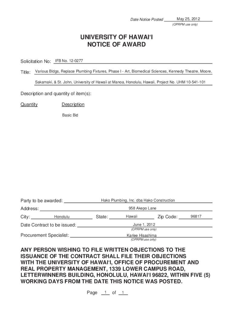 May 25, 2012Date Notice Posted(OPRPM use only)UNIVERSITY OF HAWAII NOTICE OF AWARD Solicitation No: IFB No. 120277 Title:Various Bldgs, Replace Plumbing Fixtures, Phase I Art, Biomedical Sciences,