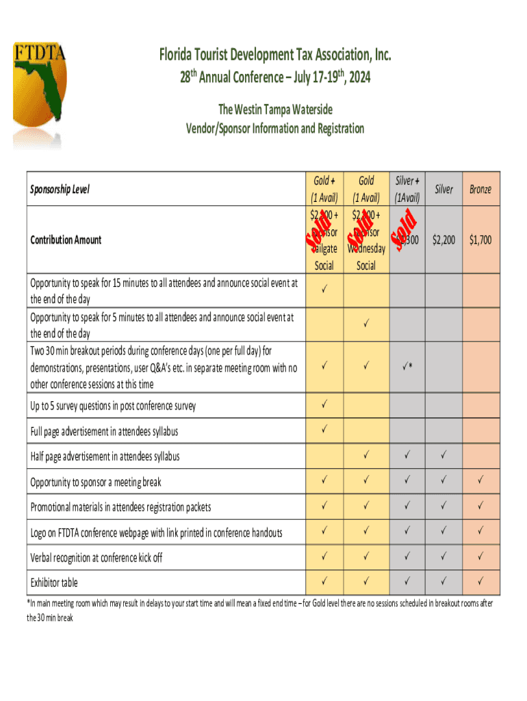 Florida Tourist Development Tax Association, Inc. 28th Annual Conference July 1719th, 2024 The Westin Tampa Waterside Vendor/Sponsor Information and RegistrationSponsorship LevelContribution AmountGold