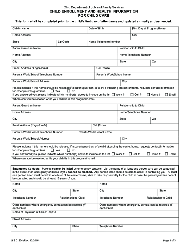 Reset FormOhio Department of Job and Family ServicesCHILD ENROLLMENT AND HEALTH INFORMATION FOR CHILD CAREThis form shall be completed prior to the child\'s first day of attendance and updated annually