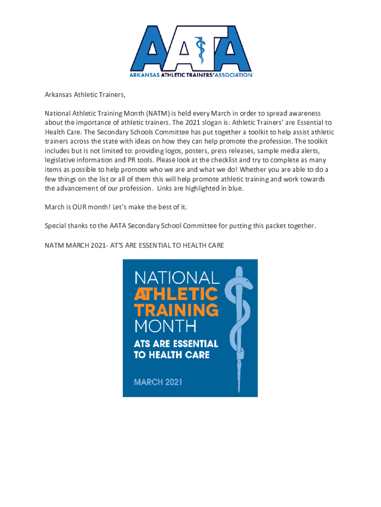 Arkansas Athletic Trainers, National Athletic Training Month (NATM) is held every March in order to spread awareness about the importance of athletic trainers. The 2021 slogan is: Athletic Trainers