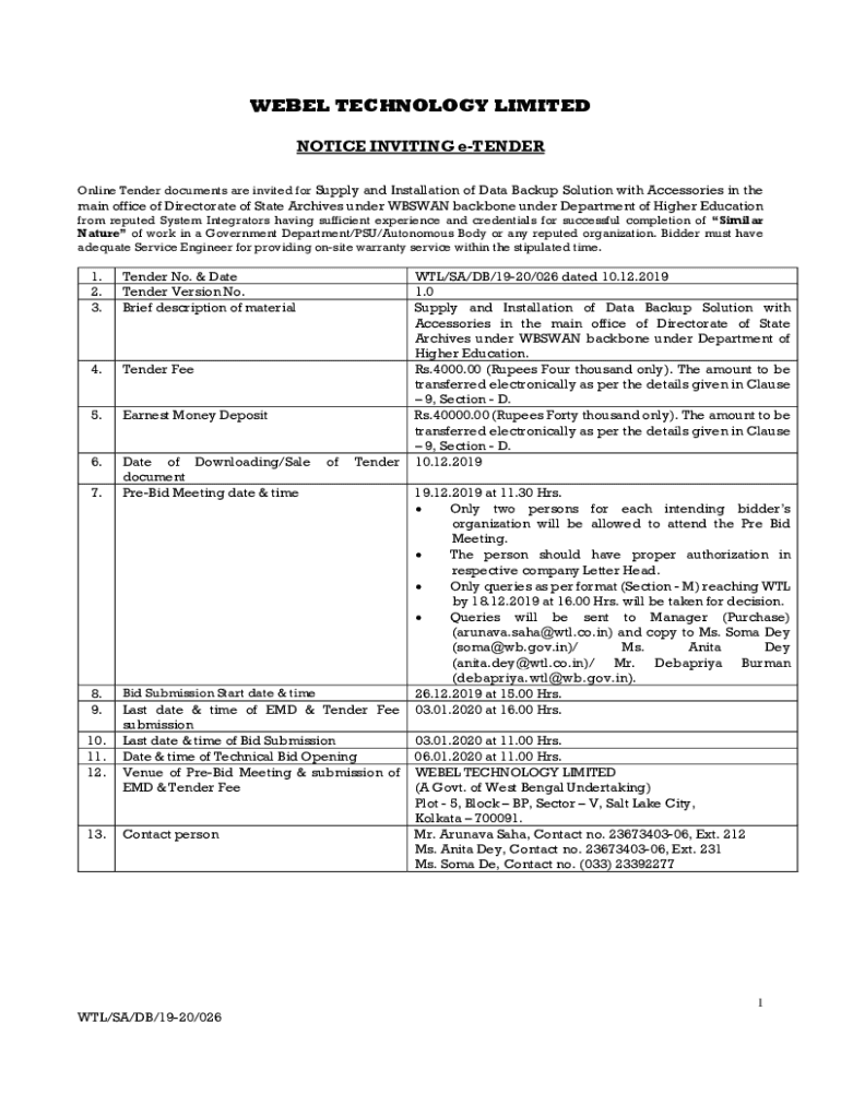 WEBEL TECHNOLOGY LIMITED NOTICE INVITING eTENDER Online Tender documents are invited for Supply and Installation of Data Backup Solution with Accessories in themain office of Directorate of State