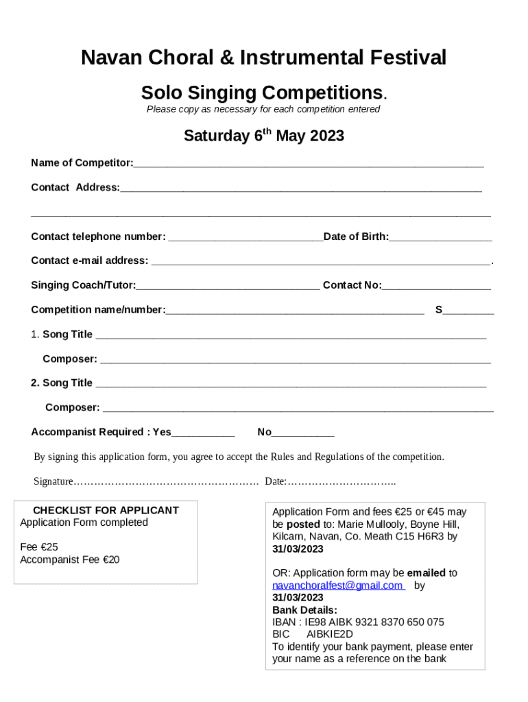 The Navan Choral and Instrumental Festival is a Word document that should be submitted to the required address to provide certain info. It needs to be completed and signed, which can be done manually in hard copy, or with the help of a certain solution e. g. PDFfiller. This tool helps to fill out any PDF or Word document directly from your browser (no software requred), customize it according to your purposes and put a legally-binding electronic signature. Once after completion, you can easily send the Navan Choral and Instrumental Festival to the relevant receiver, or multiple recipients via email or fax. The blank is printable as well due to PDFfiller feature and options proposed for printing out adjustment. Both in digital and physical appearance, your form will have got neat and professional appearance. It's also possible to turn it into a template to use later, there's no need to create a new blank form from the beginning. All you need to do is to edit the ready document.