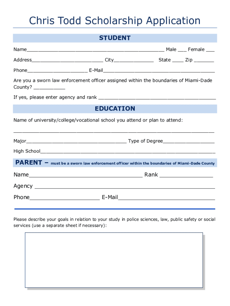 Chris Todd Scholarship Application STUDENT Name___ Male ___ Female ___ Address___ City___State ___ Zip ___Phone___ EMail___ Are you a sworn law enforcement officer assigned within the boundaries of