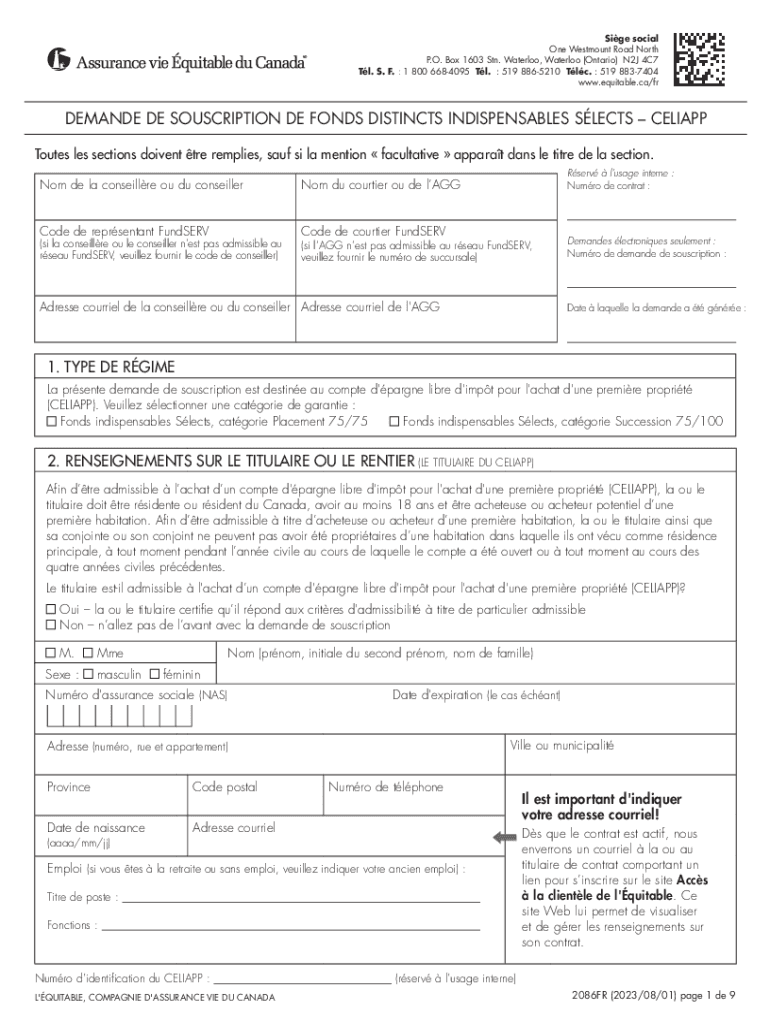 Demande de souscription de fonds indispensables SlectsCompte dpargne libre dimpt pour lachat dune premire proprit (CELIAPP) Fonds distincts pargneretraiteEn tant que cliente ou client de l\'Assurance