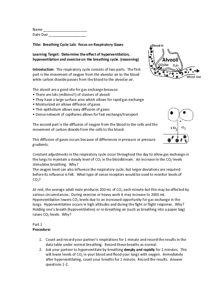 Name ___ Date Due ___ Title: Breathing Cycle Lab: Focus on Respiratory Gases Learning Target: Determine the effect of hyperventilation, hypoventilation and exercise on the breathing cycle. (reasoning)