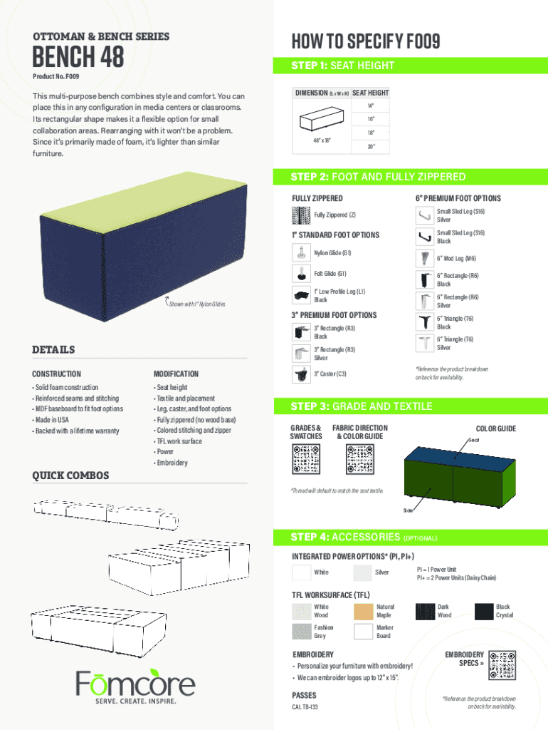 How to specify f009OTTOMAN & BENCH SERIESBENCH 48STEP 1: SEAT HEIGHTProduct No. F009DIMENSION (L × W × H) SEAT Heights multipurpose bench combines style and comfort. You can