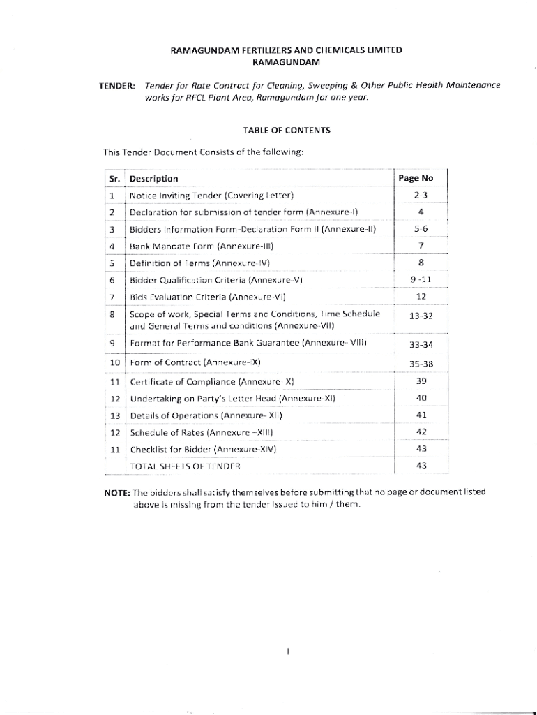 AnnexureIDECLARATION FOR SUBMISSION OF TENDER FORM To CM (HR), Ramagundam Fertilizers and Chemicals Limited, Fertilizer City, Ramagundam District: Peddapalli (Telangana) Pin Code 505 210 Dear Sir,