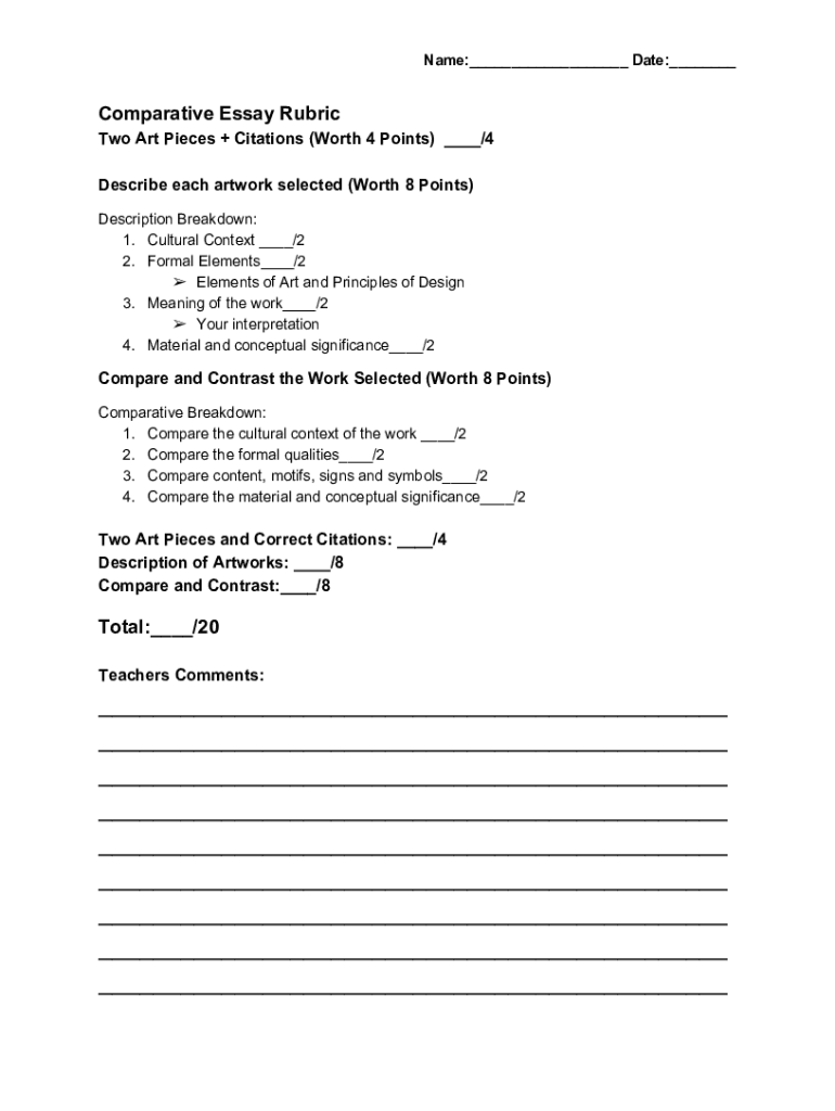Name:___ Date:___Comparative Essay Rubric Two Art Pieces + Citations (Worth 4 Points) ___/4 Describe each artwork selected (Worth 8 Points) Description Breakdown: 1. Cultural Context ___/2 2. Formal