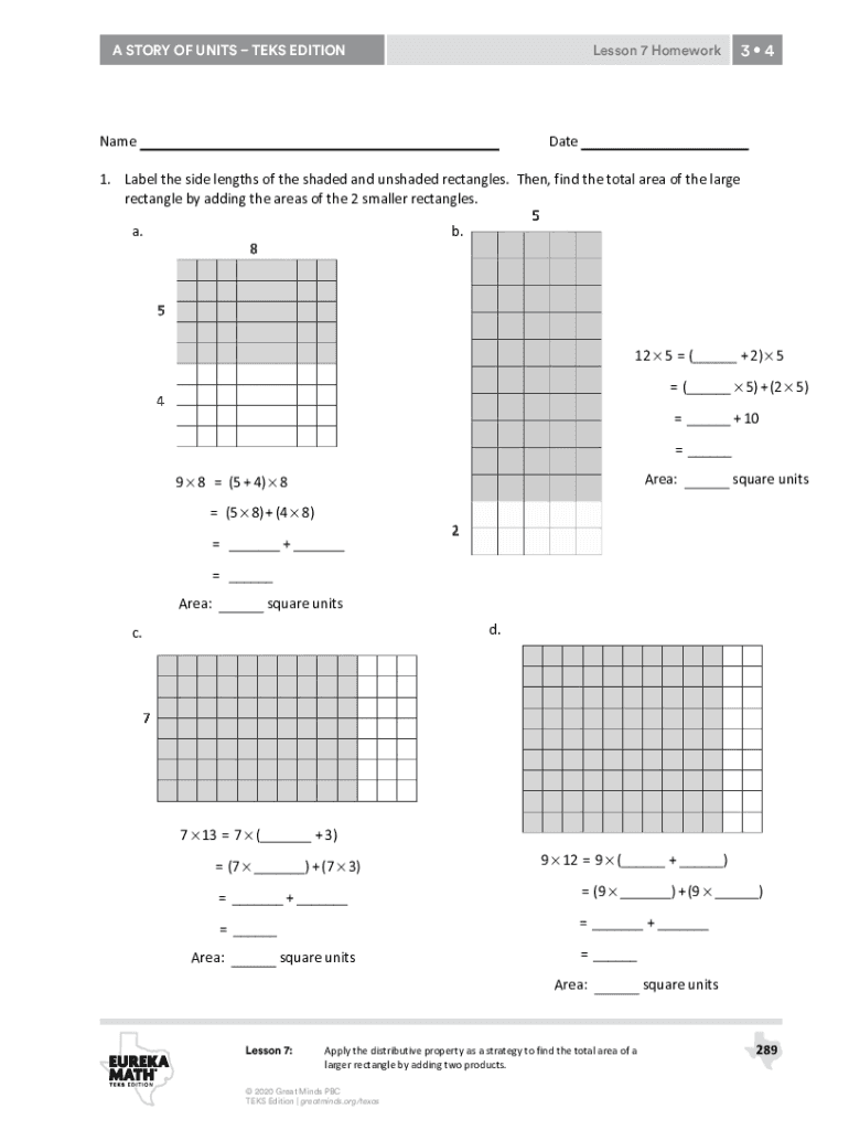 A STORY OF UNITS TEKS EDITIONLesson 7 Homework Helper341. Label the side lengths of the shaded and unshaded rectangles. Then, find the total area of the large rectangle by adding the areas of the