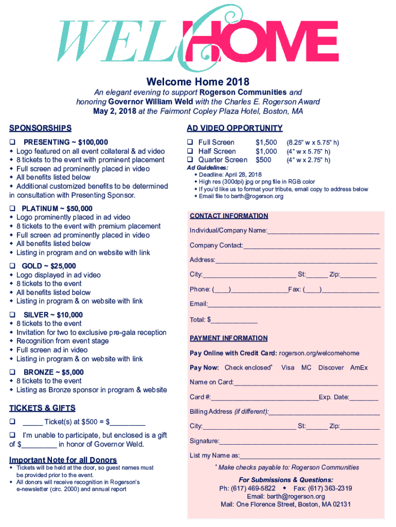 Welcome Home 2018An elegant evening to support Rogerson Communities and honoring Governor William Weld with the Charles E. Rogerson Award May 2, 2018 at the Fairmont Copley Plaza Hotel, Boston, MA