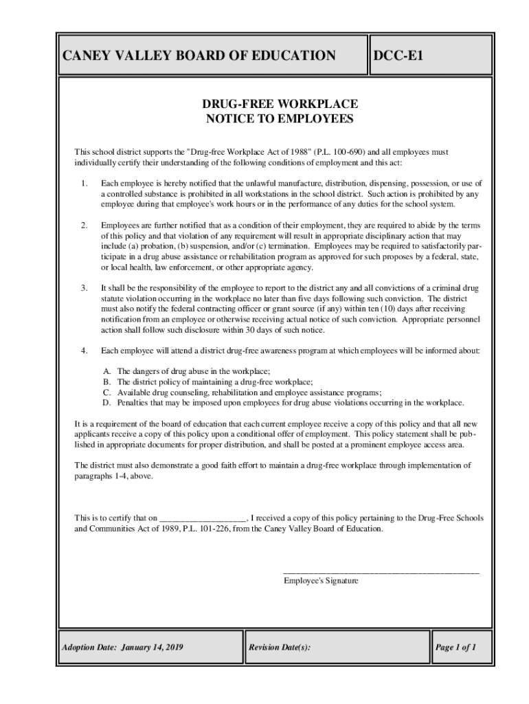 CANEY VALLEY BOARD OF EDUCATIONDCCE1DRUGFREE WORKPLACE NOTICE TO EMPLOYEES This school district supports the \"Drugfree Workplace Act of 1988\" (P.L. 100690) and all employees must individually certify