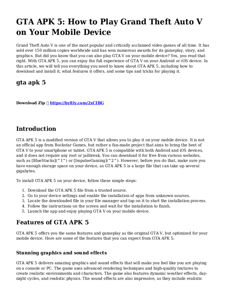 GTA APK 5: How to Play Grand Theft Auto V on Your Mobile Device Grand Theft Auto V is one of the most popular and critically acclaimed video games of all time. It has sold over 150 million copies
