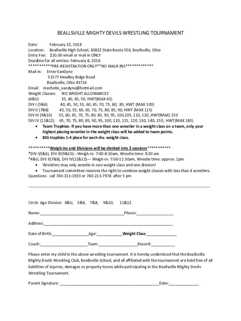 BEALLSVILLE MIGHTY DEVILS WRESTLING TOURNAMENT Date: February 10, 2018 Location: Beallsville High School, 43822 State Route 556, Beallsville, Ohio Entry Fee: $20.00 email or mail in ONLY Deadline