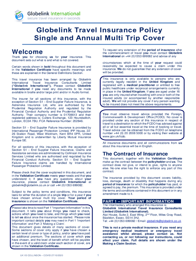Globelink Travel Insurance Policy Single and Annual Multi Trip Cover To request any extension of the period of insurance after the commencement of travel you must contact Globelink International on