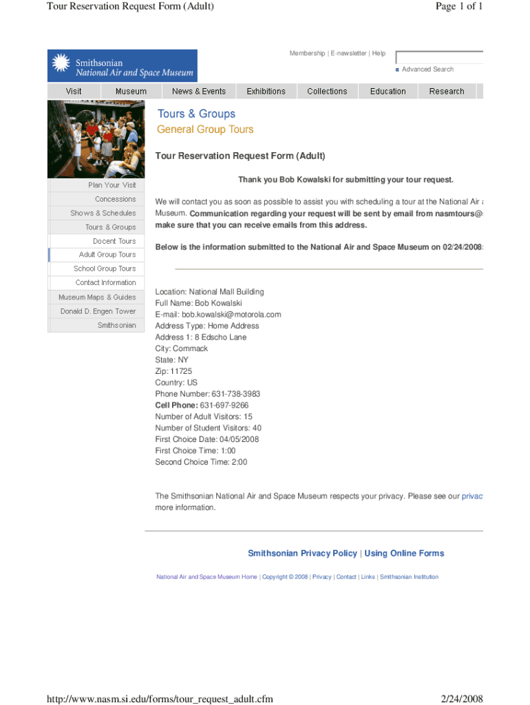 Tour Reservation Request Form (Adult)Page 1 of 1Membership | Newsletter | Help