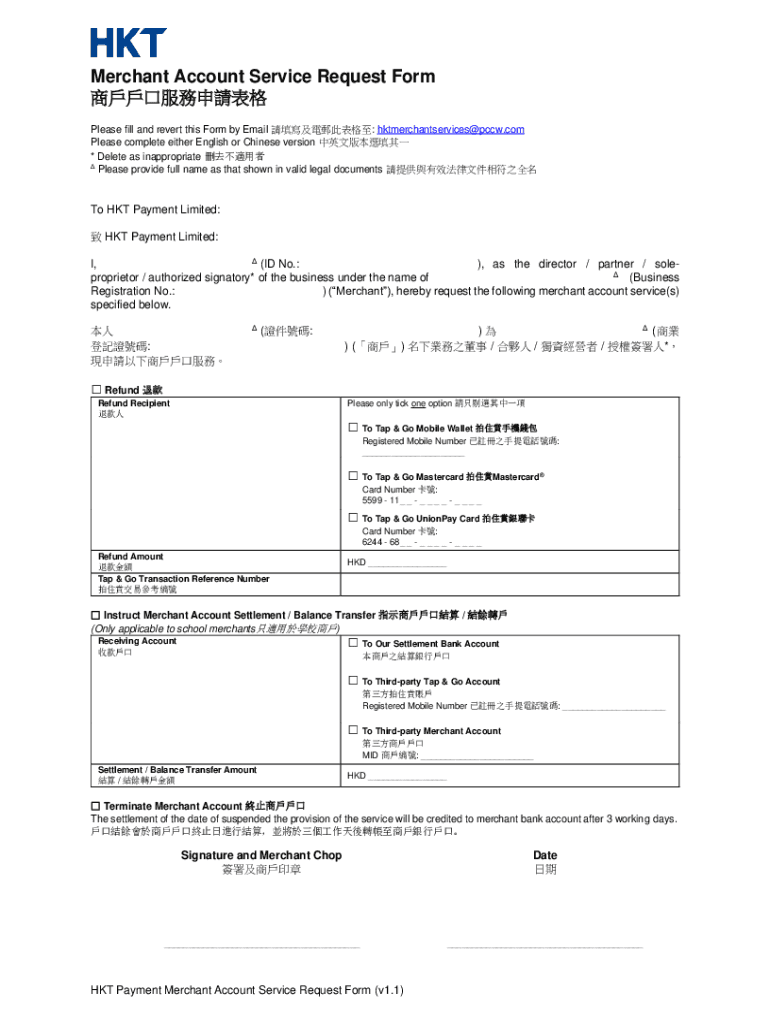 Merchant Account Service Request Form Please fill and revert this Form by Email : hktmerchantservices@pccw.com Please complete either English or Chinese version * Delete as inappropriate Please provide