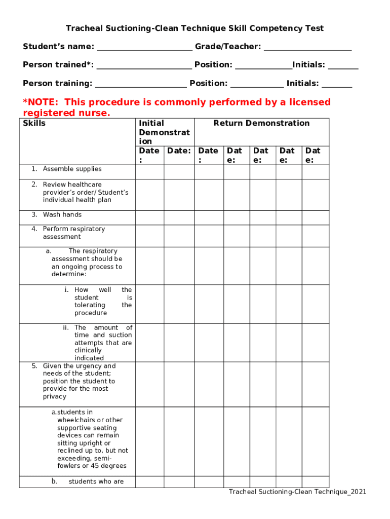 Instructions for the form Tracheal Suctioning-Clean Technique Skill Competency Test