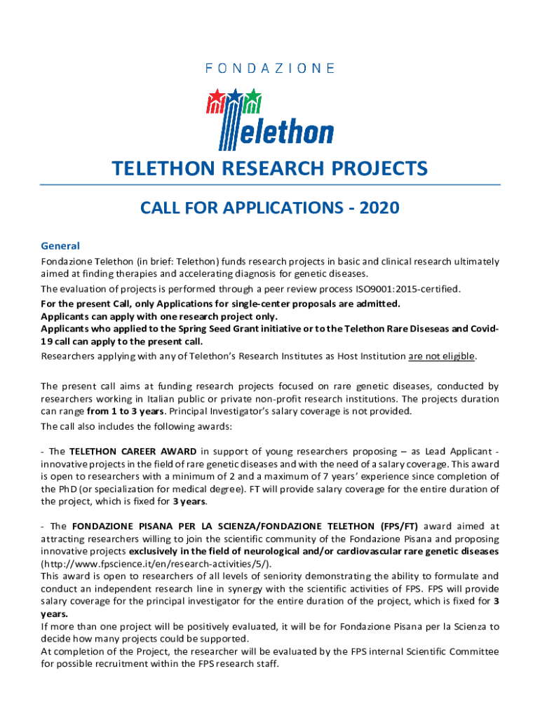 TELETHON RESEARCH PROJECTS CALL FOR APPLICATIONS 2020 General Foundation Telethon (in brief: Telethon) funds research projects in basic and clinical research ultimately aimed at finding therapies