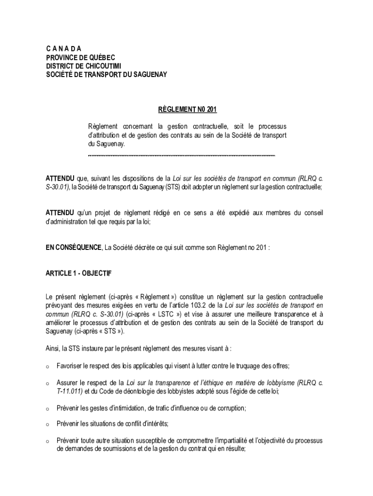 CANADA PROVINCE DE QUBEC DISTRICT DE CHICOUTIMI SOCIT DE TRANSPORT DU SAGUENAYRGLEMENT N0 201 Rglement concernant la gestion contractuelle, soit le processus dattribution et de gestion des contrats