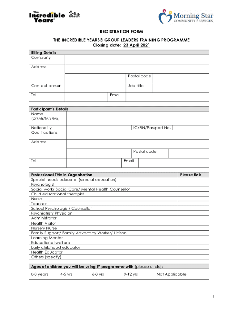 REGISTRATION FORM THE INCREDIBLE YEARS GROUP LEADERS TRAINING PROGRAMME Closing date: 23 April 2021 Billing Details Company Address Postal code Contact personJob titleTelEmailParticipants Details