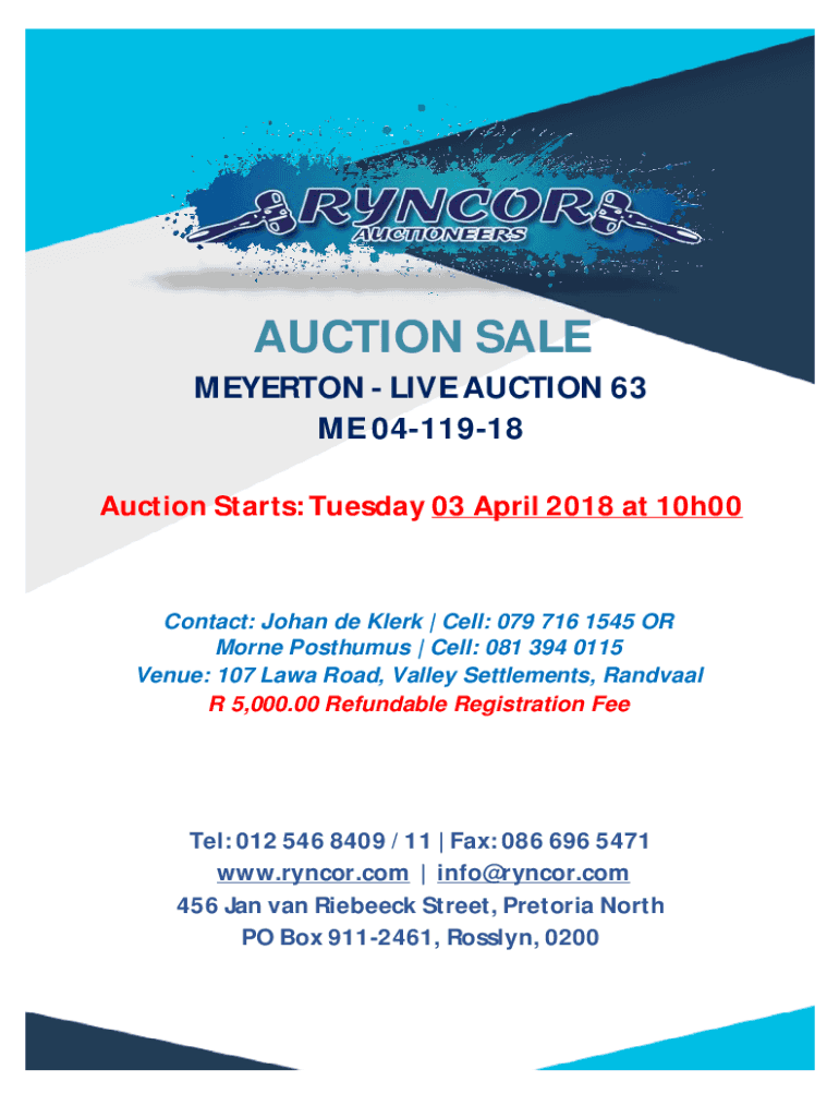 Auction Starts: Tuesday 03 April 2018 at 10h00Contact: Johan de Klerk | Cell: 079 716 1545 OR