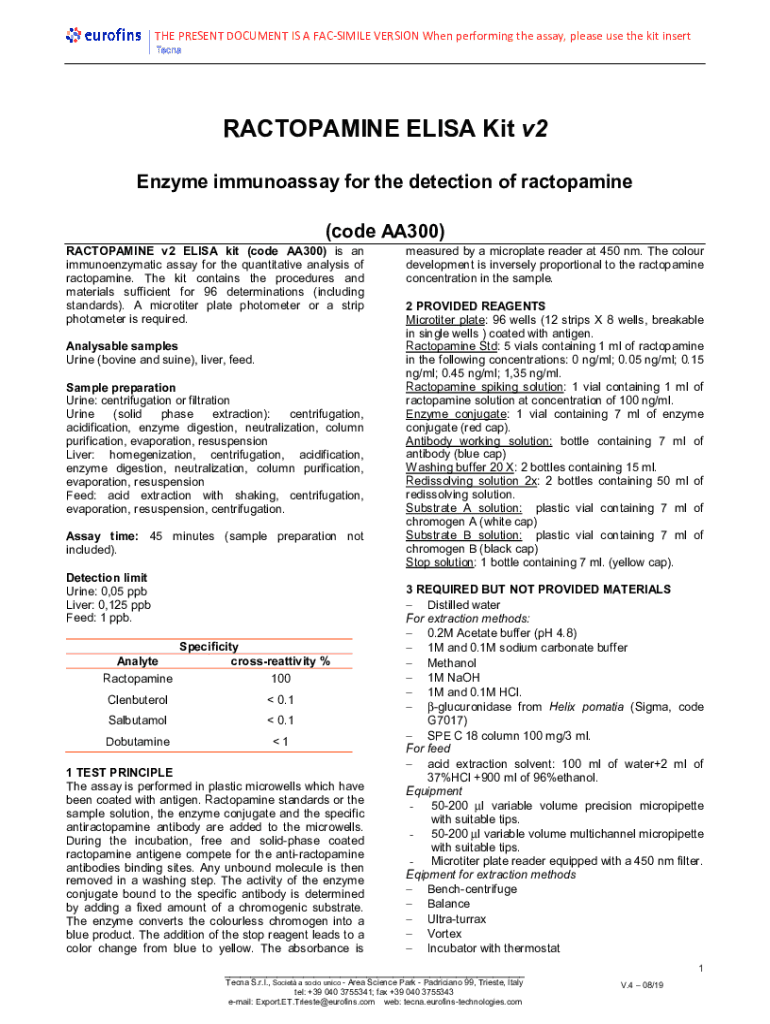 THE PRESENT DOCUMENT IS A FACSIMILE VERSION When performing the assay, please use the kit insertRACTOPAMINE ELISA Kit v2 Enzyme immunoassay for the detection of ractopamine (code AA300) RACTOPAMINE