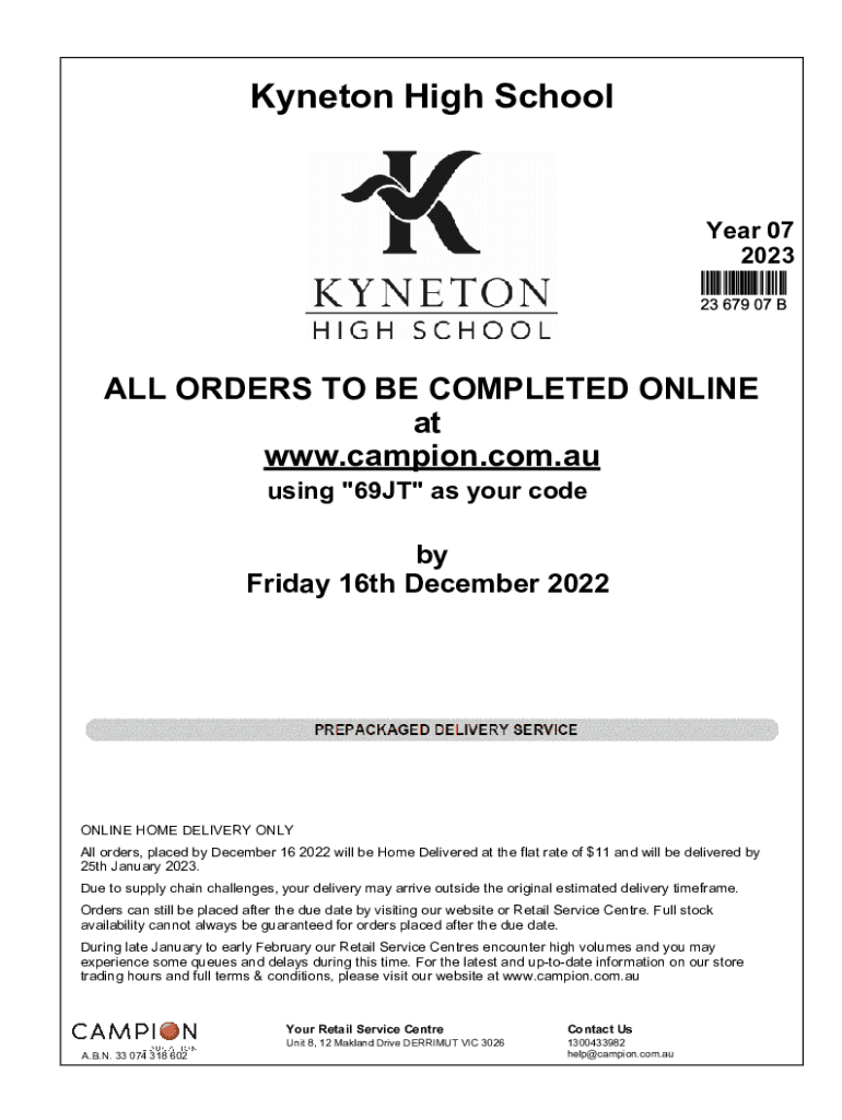 Kyneton High SchoolYear 07 2023ALL ORDERS TO BE COMPLETED ONLINE at www.campion.com.au using \"69JT\" as your codeby Friday 16th December 2022ONLINE HOME DELIVERY ONLY All orders, placed by December