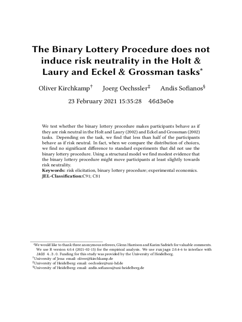 The Binary Lottery Procedure does not induce risk neutrality in the Holt & Laury and Eckel & Grossman tasks Oliver KirchkampJoerg Oechssler23 February 2021 15:35:28Andis Sofianos46d3e0eWe test whether