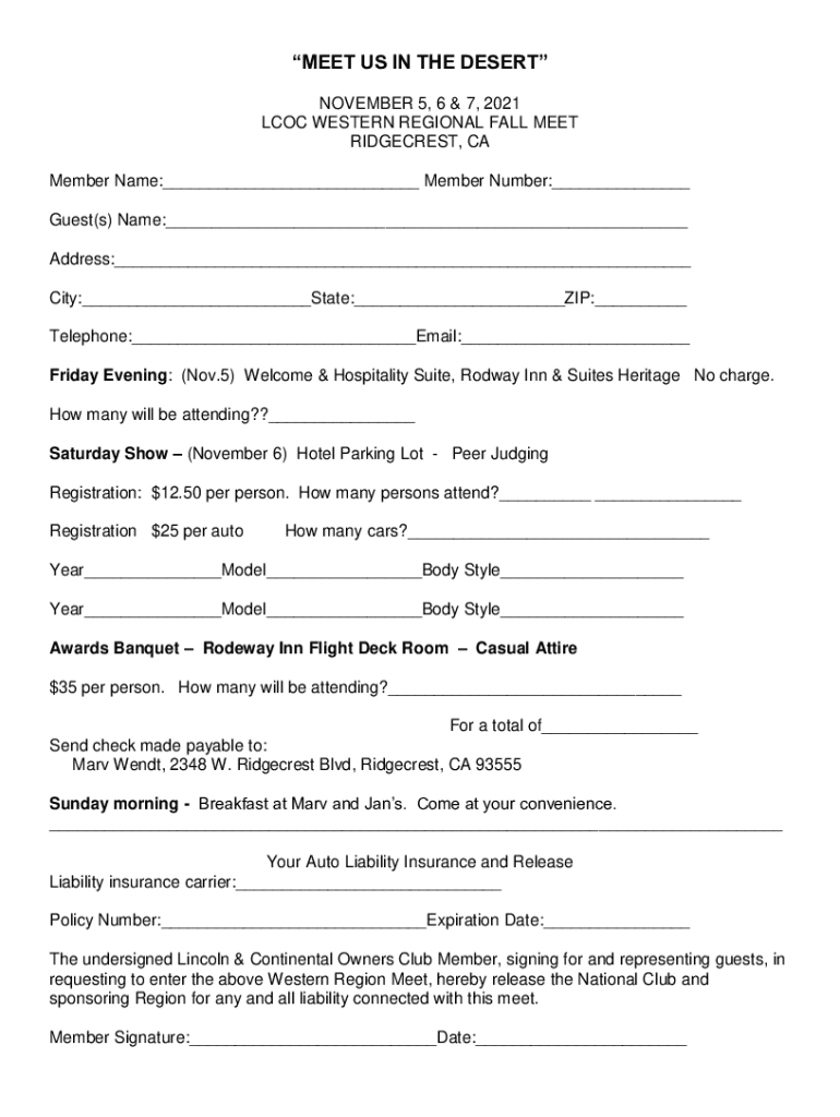 MEET US IN THE DESERT NOVEMBER 5, 6 & 7, 2021 LCOC WESTERN REGIONAL FALL MEET RIDGECREST, CA Member Name:___ Member Number:___ Guest(s) Name:___ Address:___ City:___State:___ZIP:___ Telephone:___Email:___