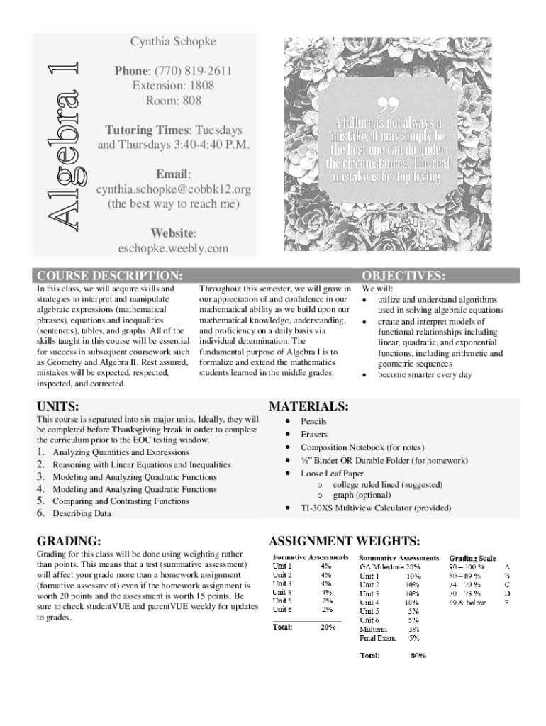 Cynthia Schopke Phone: (770) 8192611 Extension: 1808 Room: 808 Tutoring Times: Tuesdays and Thursdays 3:404:40 P.M. Email: cynthia.schopke@cobbk12.org (the best way to reach me) Website: eschopke.weebly.com