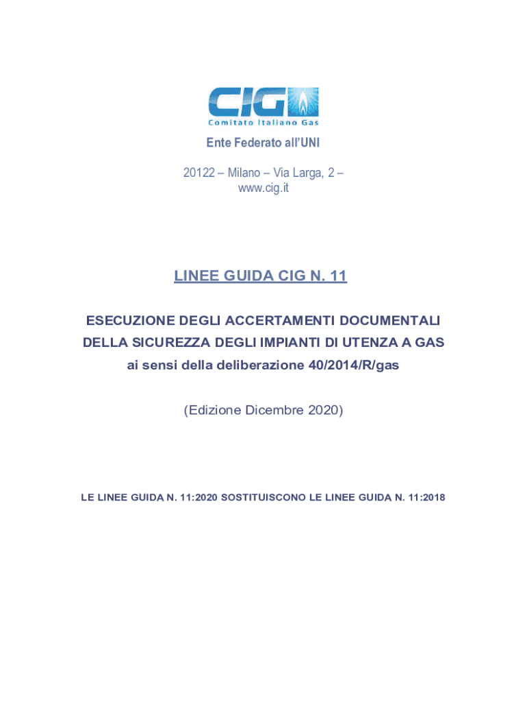 Ente Federato allUNI 20122 Milano Via Larga, 2 www.cig.itLINEE GUIDA CIG N. 11 ESECUZIONE DEGLI ACCERTAMENTI DOCUMENTALI DELLA SICUREZZA DEGLI IMPIANTI DI UTENZA A GAS ai sensi della deliberazione