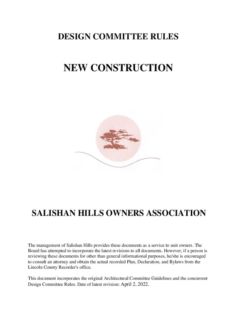 DESIGN COMMITTEE RULESNEW CONSTRUCTIONSALISHAN HILLS OWNERS ASSOCIATIONThe management of Salishan Hills provides these documents as a service to unit owners. The Board has attempted to incorporate