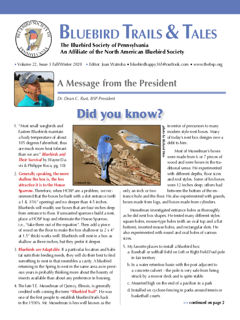 Bluebird Trails & Tales The Bluebird Society of Pennsylvania An Affiliate of the North American Bluebird Society Volume 22, Issue 3 Fall/Winter 2020 Editor: Joan Watroba bluebirdhappy365@outlook.com
