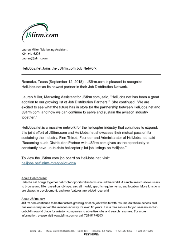 Lauren Miller / Marketing Assistant 7245476203 Lauren@jsfirm.comHeliJobs.net Joins the JSfirm.com Job Network ___ Roanoke, Texas (September 12, 2018) JSfirm.com is pleased to recognize HeliJobs.net