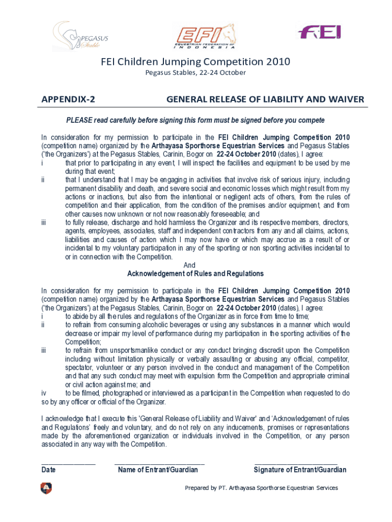 FEIChildrenJumpingCompetition2010 PegasusStables,2224OctoberAPPENDIX2GENERALRELEASEOFLIABILITYANDWAIVER PLEASE read carefully before signing this form must be signed before you compete In consideration