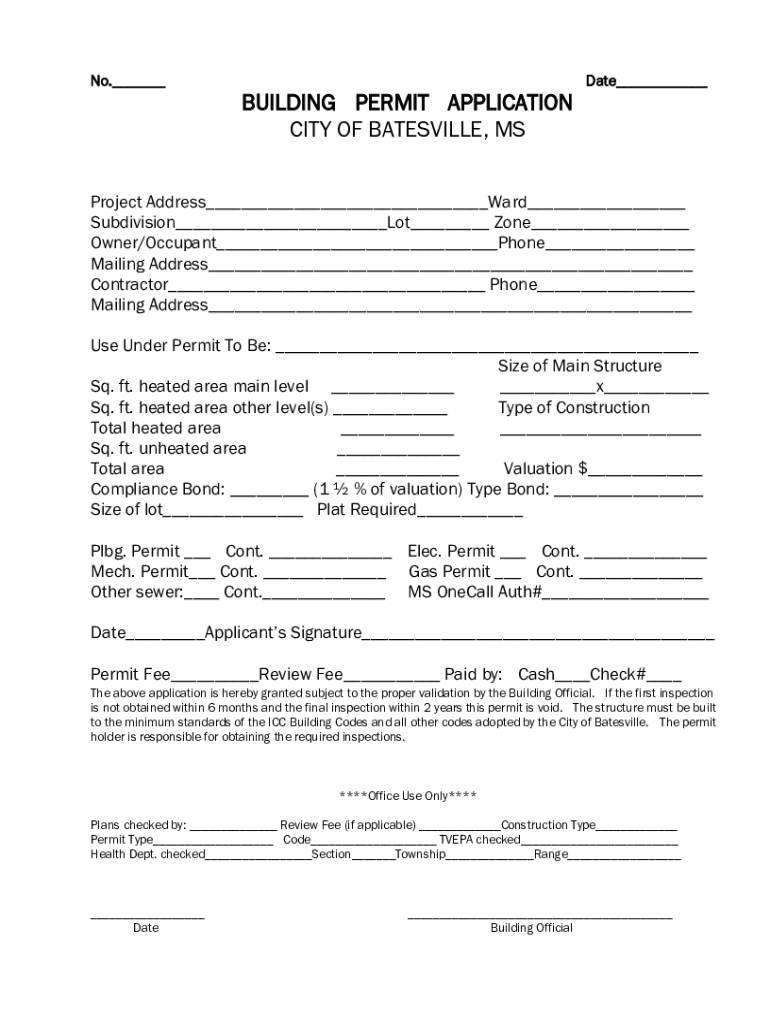 No.___BUILDING PERMIT APPLICATION CITY OF BATESVILLE, MSDate___Project Address___Ward___ Subdivision___Lot___ Zone___ Owner/Occupant___Phone___ Mailing Address___ Contractor___ Phone___ Mailing Address___