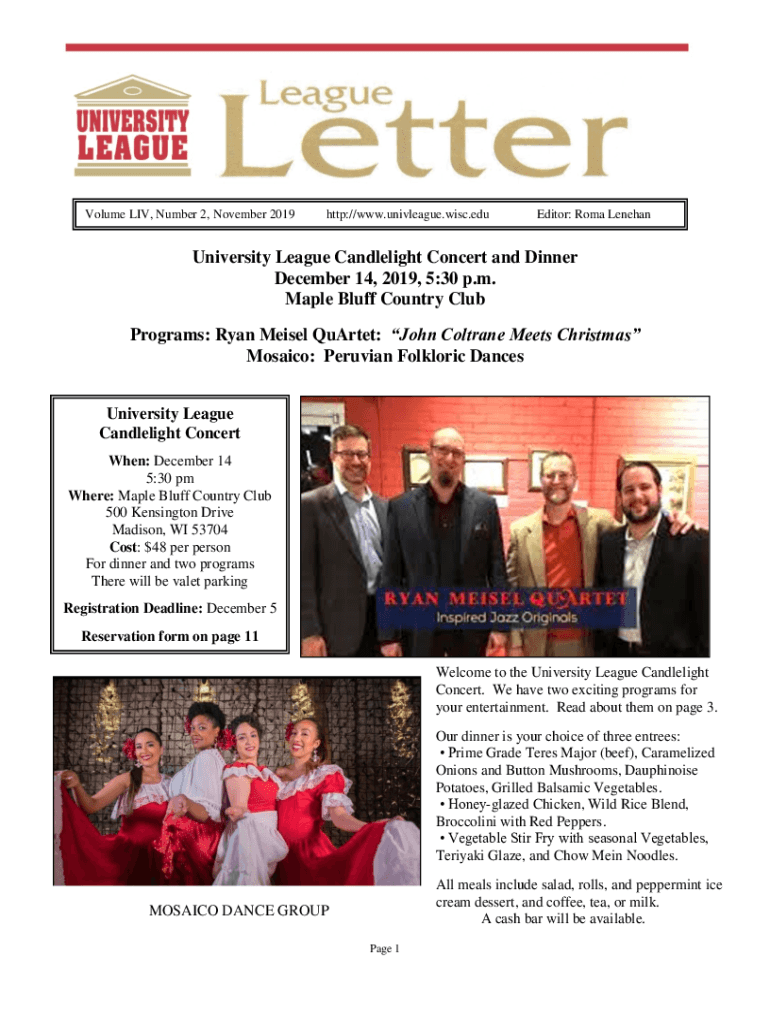 Volume LIV, Number 2, November 2019http://www.univleague.wisc.eduEditor: Roma LenehanUniversity League Candlelight Concert and Dinner December 14, 2019, 5:30 p.m. Maple Bluff Country Club Programs: