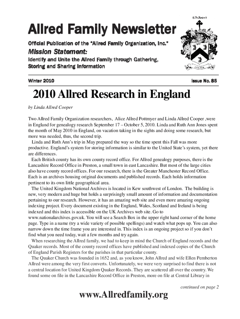 Allred Family Newsletter Of Allred FFamily amily Organization, Inc. Offficial Publication of the AllredMission Stat ement Statement ement:: Identify and Unit e the Allred FFamily amily thr ough Gathering,