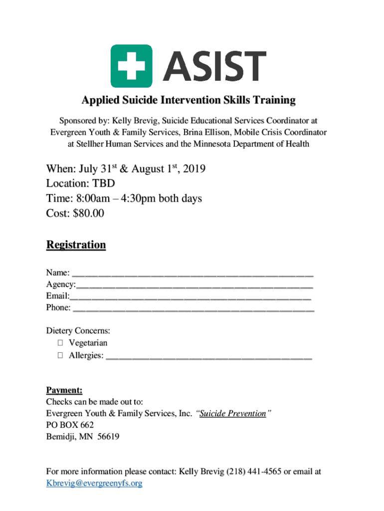 Applied Suicide Intervention Skills Training Sponsored by: Kelly Brevig, Suicide Educational Services Coordinator at Evergreen Youth & Family Services, Brina Ellison, Mobile Crisis Coordinator at
