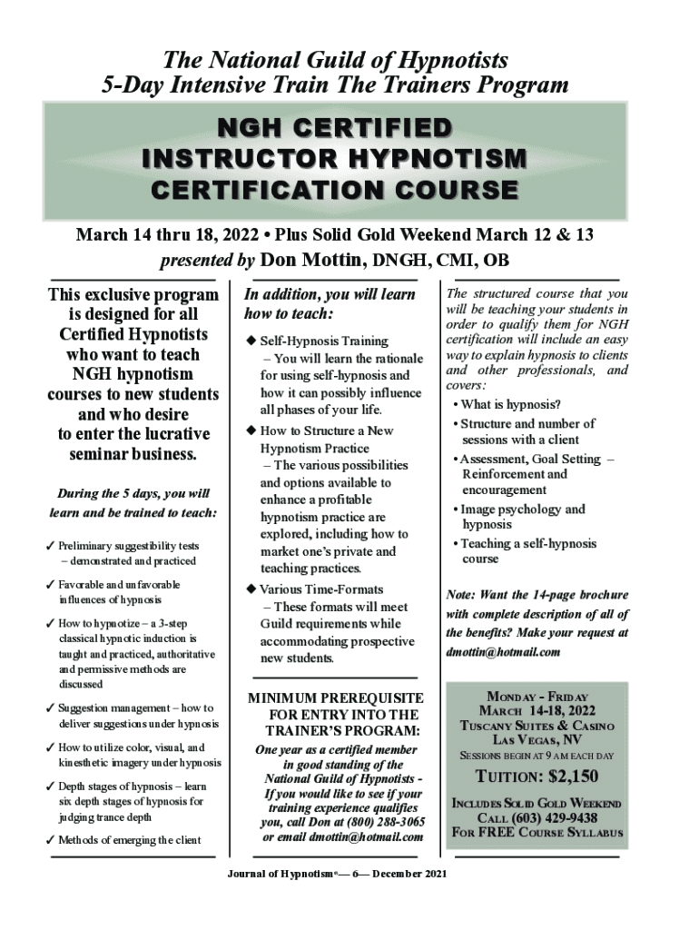 The National Guild of Hypnotists 5Day Intensive Train The Trainers Program NGH CERTIFIED INSTRUCTOR HYPNOTISM CERTIFICATION COURSE March 14 thru 18, 2022 Plus Solid Gold Weekend March 12 & 13 presented