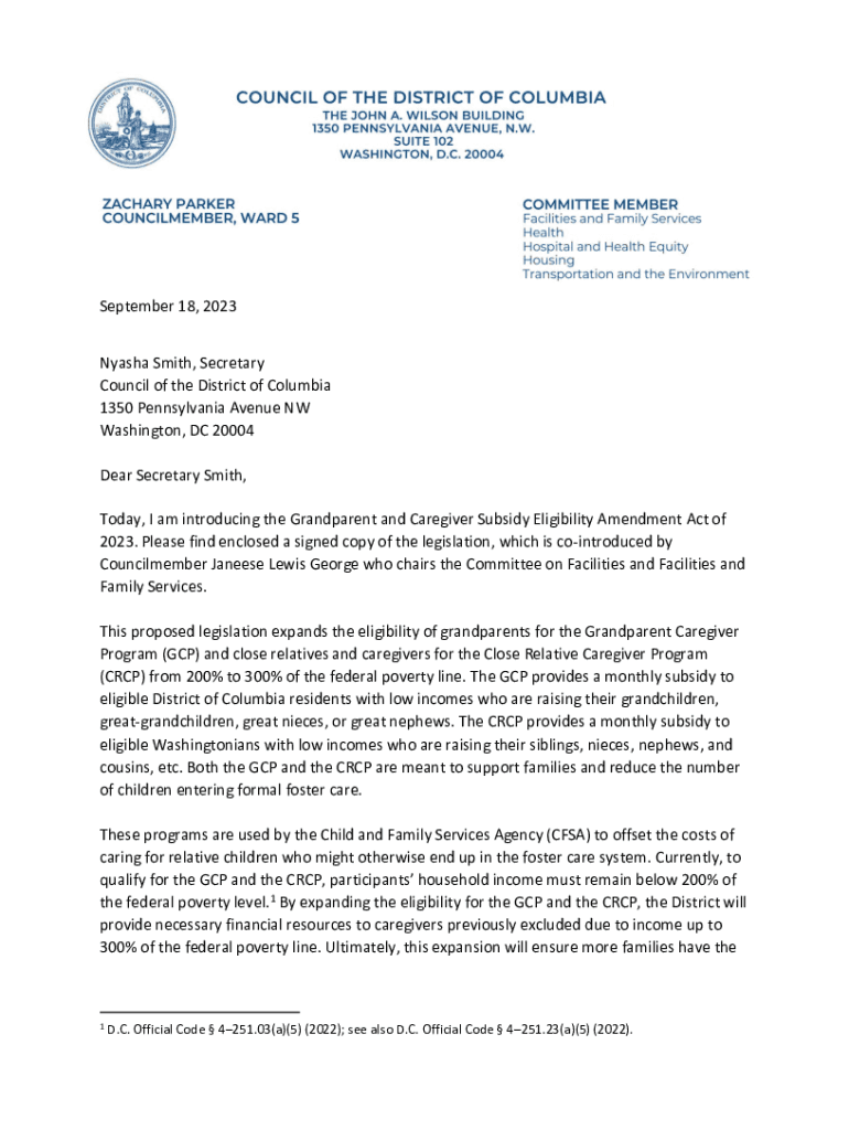 September 18, 2023 Nyasha Smith, Secretary Council of the District of Columbia 1350 Pennsylvania Avenue NW Washington, DC 20004 Dear Secretary Smith, Today, I am introducing the Grandparent and Caregiver